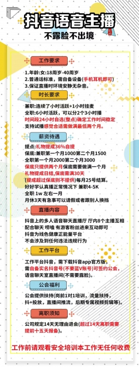 4. 我们是一个多人厅播的模式的语音聊天,应聘者家中工作即可,